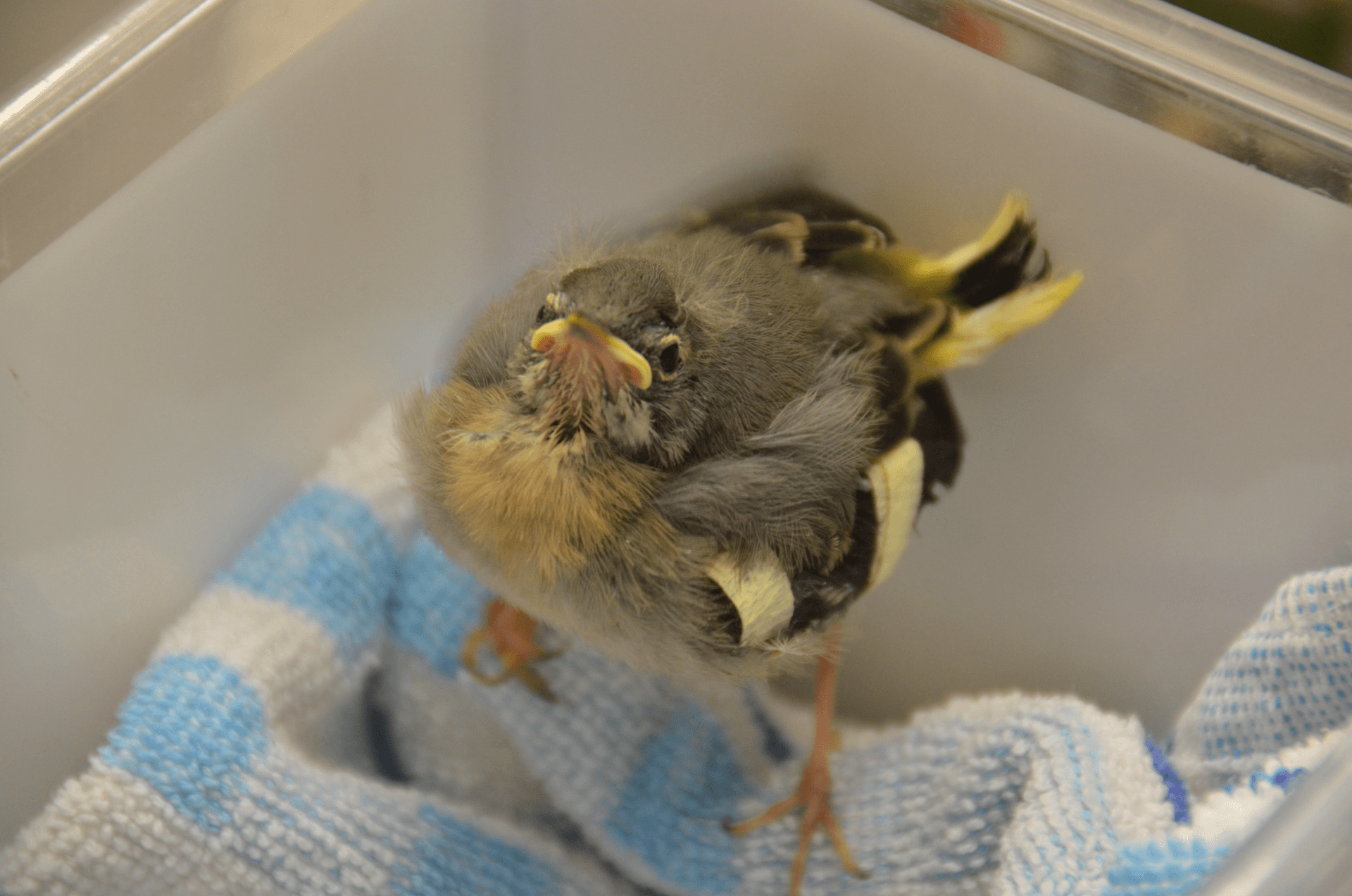Gebrochene Flügel sind bei den zarten Singvögeln leider sehr häufig die Ursache für ihre Aufnahme in der Pflegestation. Weil ihre Flügel so klein und dünn sind, ist eine Operation bei Vögeln unter Amselgröße meist nicht möglich, und die Brüche müssen so gut es geht unter Verband abheilen. Danach folgt eine oft langwierige Rehabilitationsphase, in der sich zeigen muss, ob die Knochen gut verheilt sind und der Patient wieder gut genug fliegen lernt, um Nahrung finden und vor Feinden flüchten zu können. Die Ursachen für die Brüche sind vielfältig; oftmals passiert dies bei Kollisionen mit Fensterscheiben oder Autos, sowie Angriffen durch Hauskatzen.